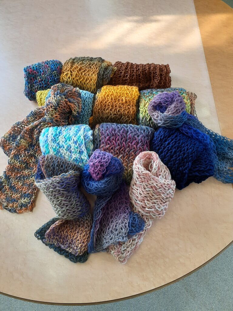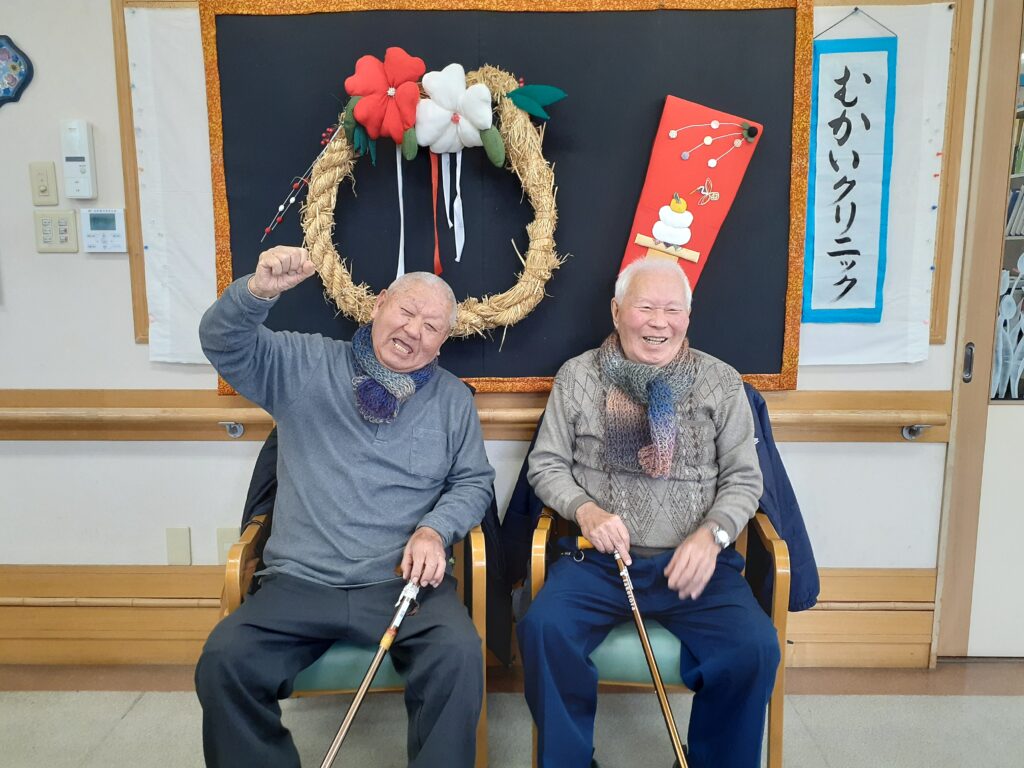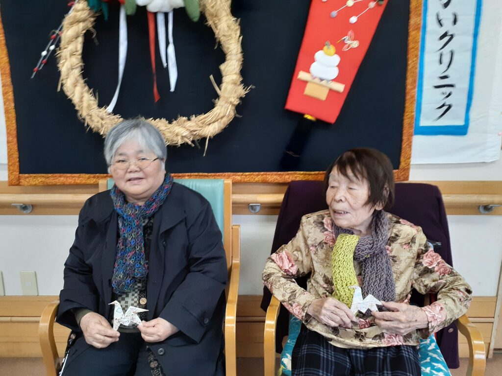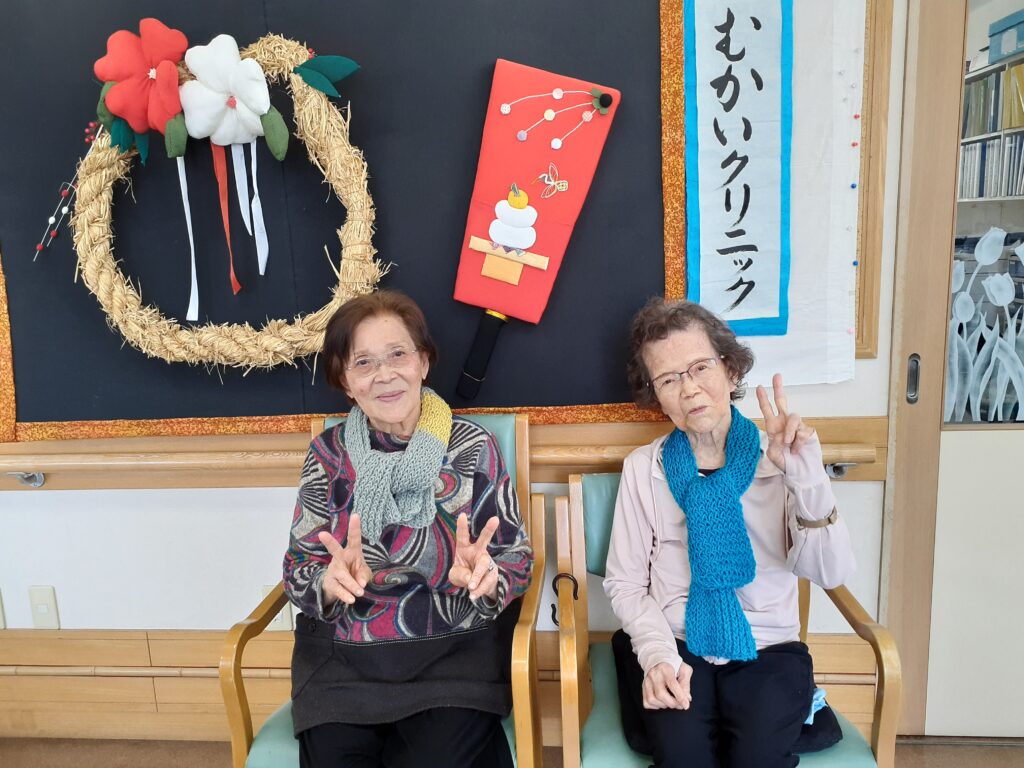 通所リハビリテーションでは地域交流として「あおぞら児童クラブ」さんと長年お付き合いをしております。その子供たちが年末のもちつき大会に参加して下さり、利用者さまへ手作りのマフラーをプレゼントして下さいました。今年の馬年にちなんで、ペガサスの折り紙付きでした~。毎年、いろんな毛糸と編み方を工夫して下さってます!一つ一つ子供たちが手作りしてくれたマフラーに 身体も心も温かくなりました。