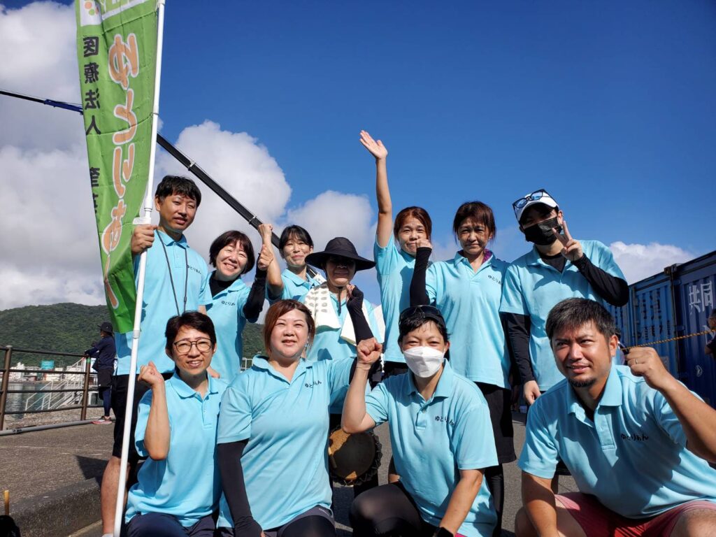 8/2(土)舟こぎ競争、、、晴天に恵まれ、一般の部99チーム、女子・子どもの部41チーム、白熱した1日となりました。法人から出場した 女子こどもの部、4組目「むかいクリニック」7組目「ゆとりあん」、一緒に練習をしている一般の部「わんわんネット」どちらも初戦突破ならず!!6月の小湊港祭りに参加し、その後練習を重ねましたが、残念な結果でした。そんな私たちですが、多くの応援を頂き、大変楽しい1日になりました。