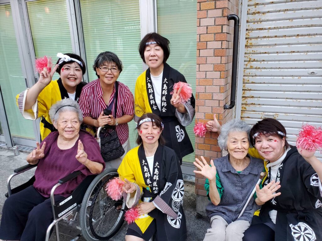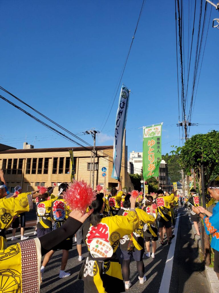 翌日8/3(日)奄美祭りの最終日。パレード2部17:30~大島郡医師会グループ総勢約110名の中、私たちも参加しました。向井院長はスタート地点で私たちを送り出し、業務へ戻って行かれました。